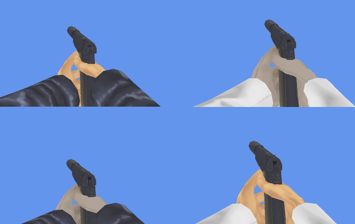 Here's some programmer art showing the key features. Basically we've brought back the separate parts from the full character model. They're just put onto a different animation rig for first person animations. So the animations will be done for each weapon/item, and then the character arms/hands will fit into those animations. It means I'll be able to support all of the clothing options of the full character without filling memory up with separate models/textures for the first person assets. In this case we're swapping between different arm geometry/textures and different hand geometry/textures.
