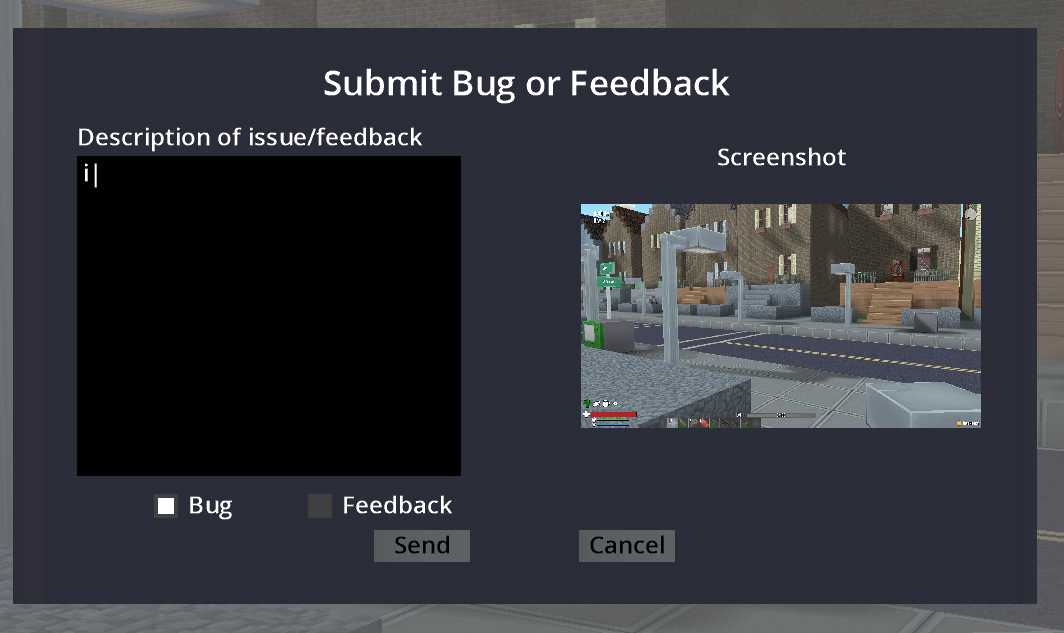 Last month I showed the crash reporting system, but not every issue in the game will cause a crash. I've added a bug reporting system in game to cover the other types of issues. Simply press B+U+G at the same time to bring it up. You can then give a short description of the bug and a screenshot will be sent along with it. You can also just send feedback if you think something should be improved or changed.